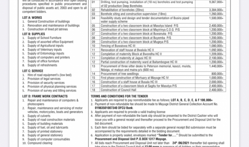 Mayuge District local government has received funds from the government of Uganda to acquisition the following services, supplies and work.